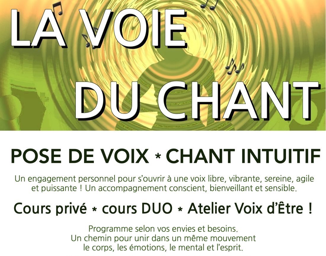 La Voie du Chant : approche intuitive, vibratoire et thérapeutique pour libérer la voix, développer la confiance en soi et découvrir l'unité qui lie la voix, la respiration et le mouvement corporel.