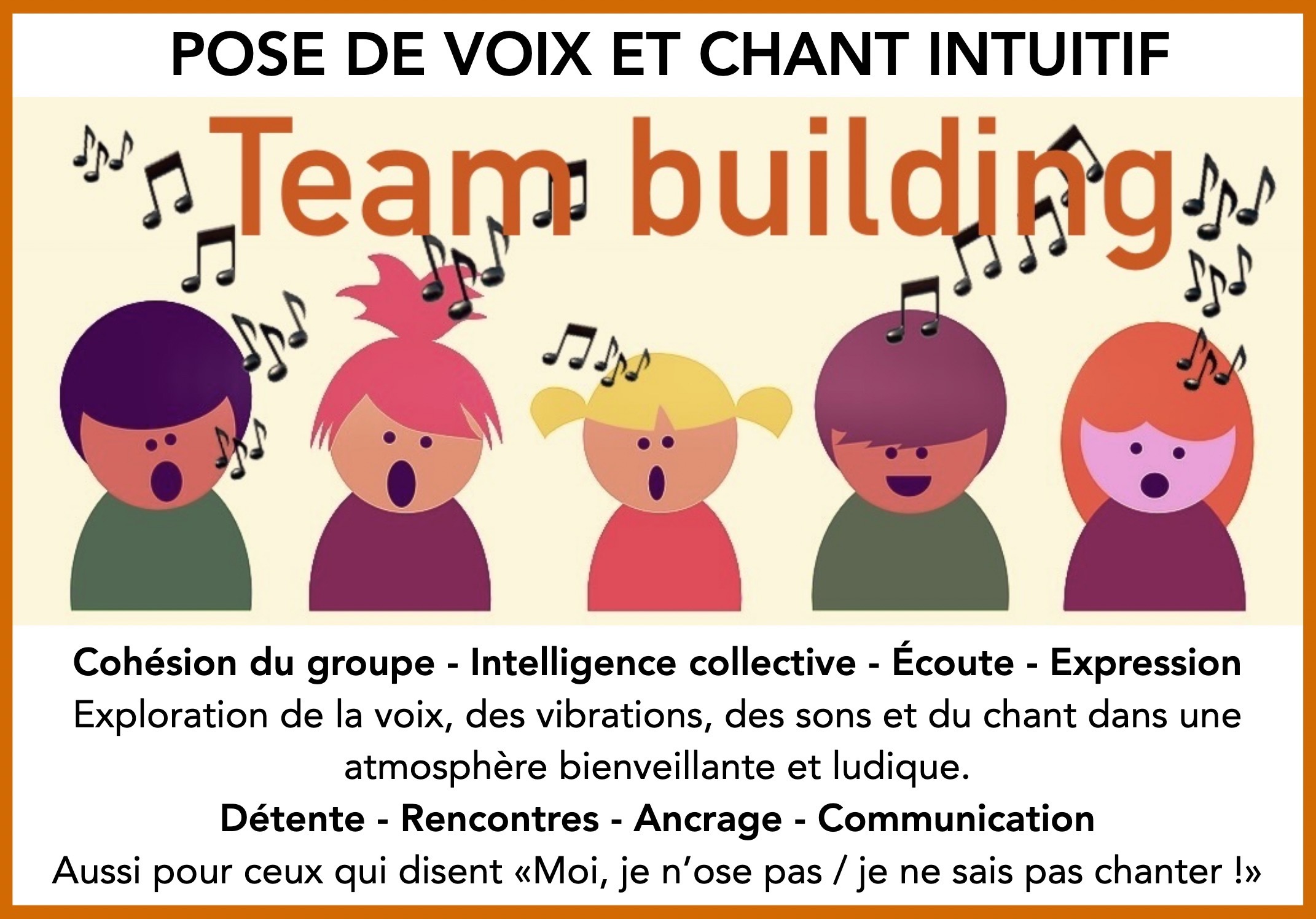 Atelier de Team Building : Équipe à l’unis’Son ! Pour renforcer la cohésion, la communication et l’intelligence collective du groupe, grâce à l'exploration de la voix, des sons intuitifs et de la mise en vibration. Ludique et libérateur!