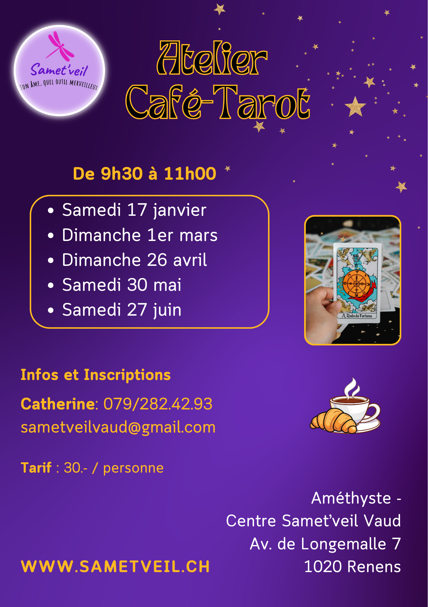 - Café-tarot : Inspiré du café-philo, c’est un moment d’échanges, de partages autour d’une thématique de la vie quotidienne, amenée par un tirage de tarot